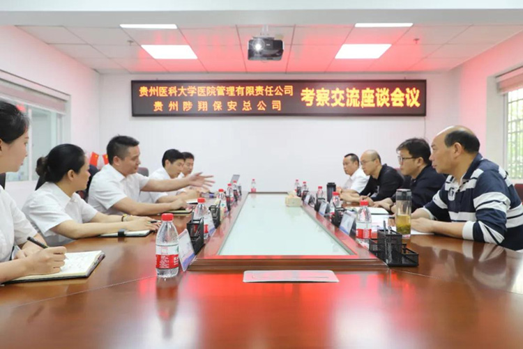 為增進(jìn)對(duì)保安公司營(yíng)運(yùn)情況的了解,2021年5月19日,貴州醫(yī)科大學(xué)科技創(chuàng)新與產(chǎn)業(yè)發(fā)展處處長(zhǎng)、醫(yī)院管理公司總經(jīng)理涂波等一行三人蒞臨貴州陟翔保安總公司考察交流,集團(tuán)公司馮波董事長(zhǎng)帶領(lǐng)班子成員與考察小組進(jìn)行座談交流。