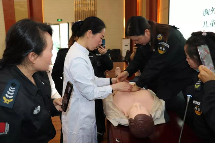 首先由新舟鎮(zhèn)衛(wèi)生院護(hù)士長(zhǎng)一行人員為參訓(xùn)保安員講解急救要領(lǐng),現(xiàn)場(chǎng)演示徒手心肺復(fù)蘇操作技巧,并要求每位保安員實(shí)操練習(xí)。