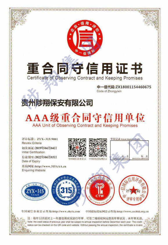 重合同守信用證書